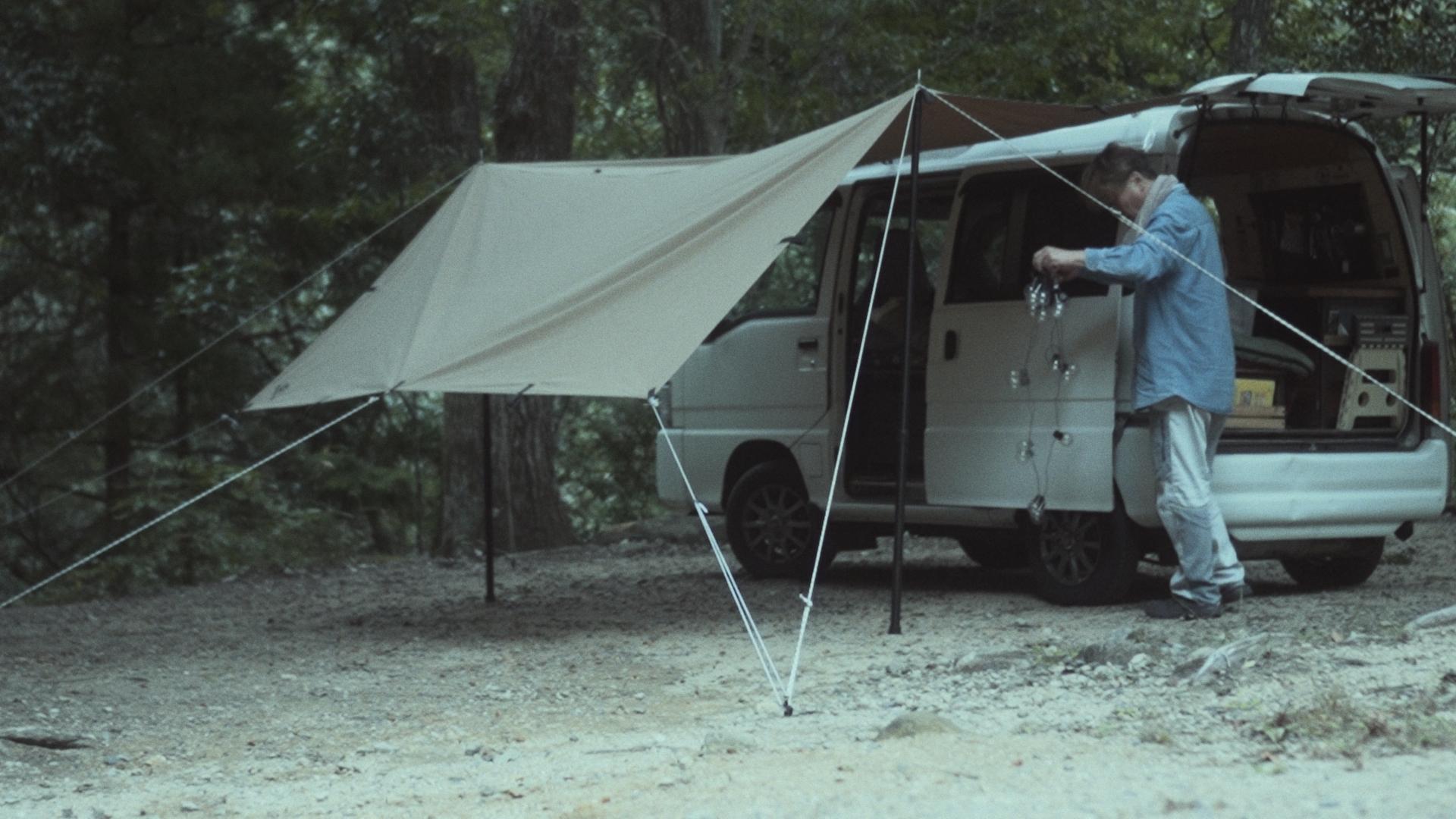 ようやくサイトに降り立ち、改めて荷物を下ろし始める。今日の寝床は、いつもの車中泊ではなく、サンバーバンの横にタープを張るスタイルだ。雨の予報が出ていたから、しっかりとしたリビングスペースを確保したかった。