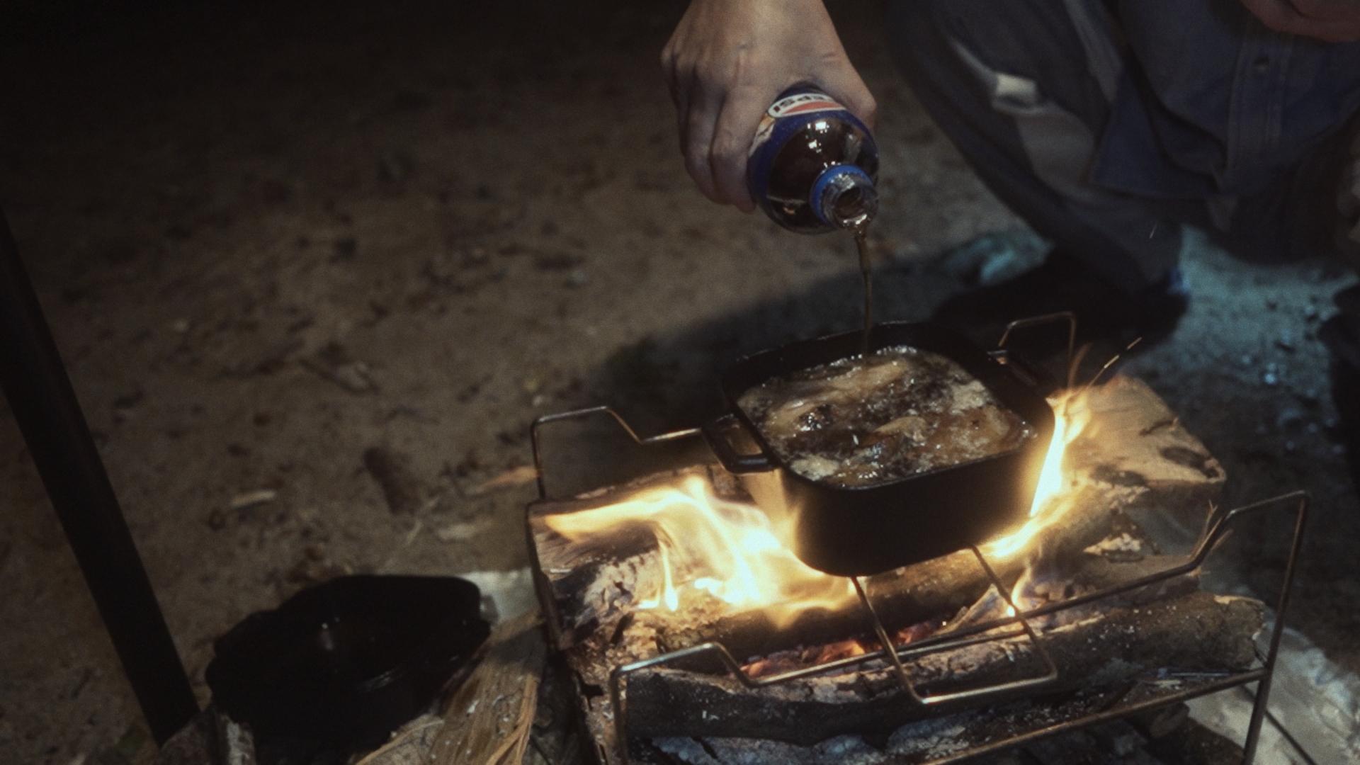 焼き目がついたら、主役の登場だ。コーラ。ちなみにペプシを買った。なぜなら、安かったからだ。そんな、大人の、少しだけやんちゃな遊び心も、ソロキャンプなら許される。麺つゆとニンニクを加え、蓋をする。